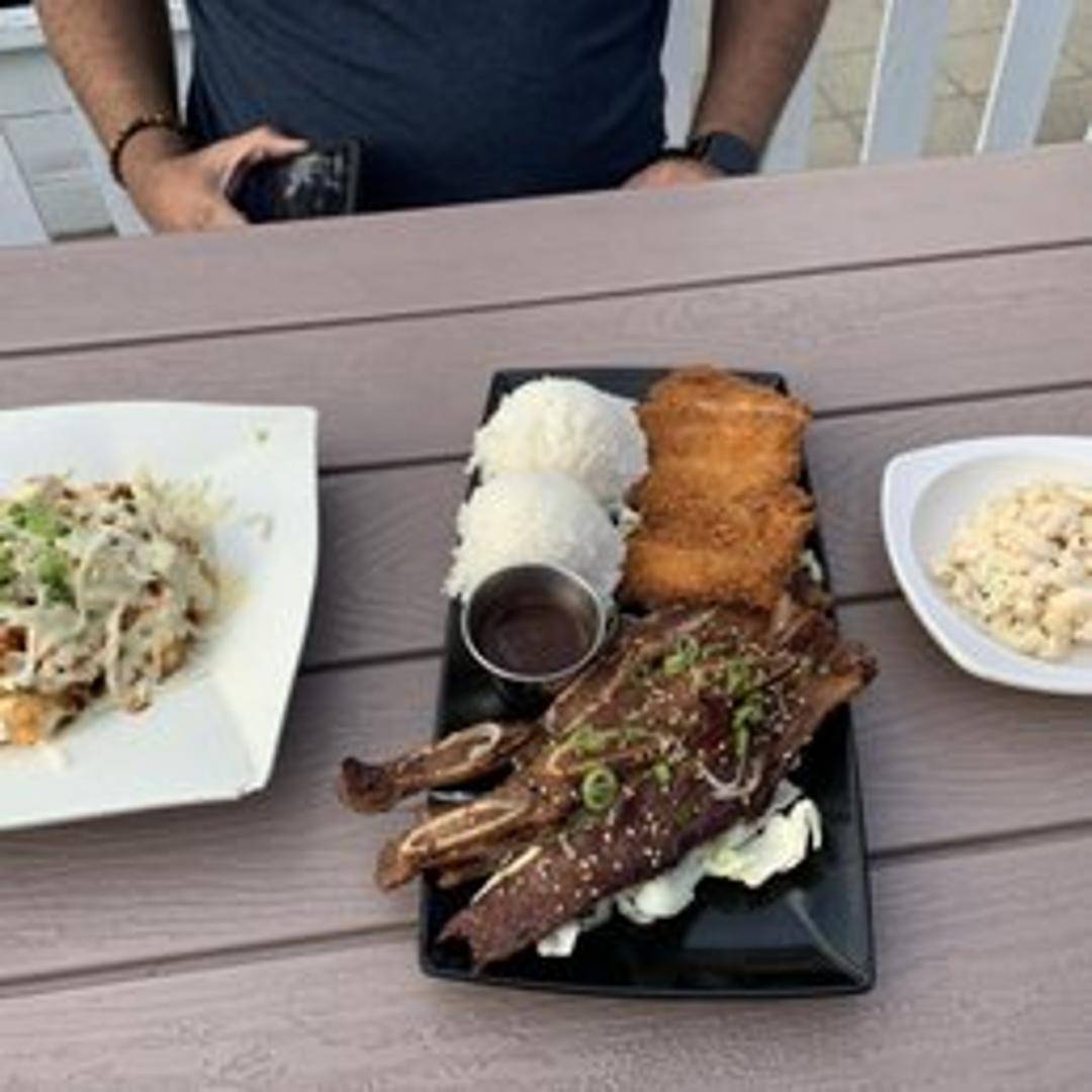 A generous serving of your choice of two entrees, accompanied by two scoops of rice and a scoop of macaroni salad.