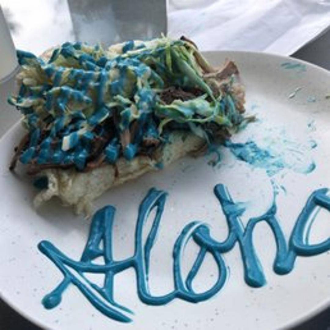 Three Hawaiian sweet rolls filled with juicy pulled pork, tangy pineapple coleslaw, and a drizzle of signature blue Hawaiian sauce.