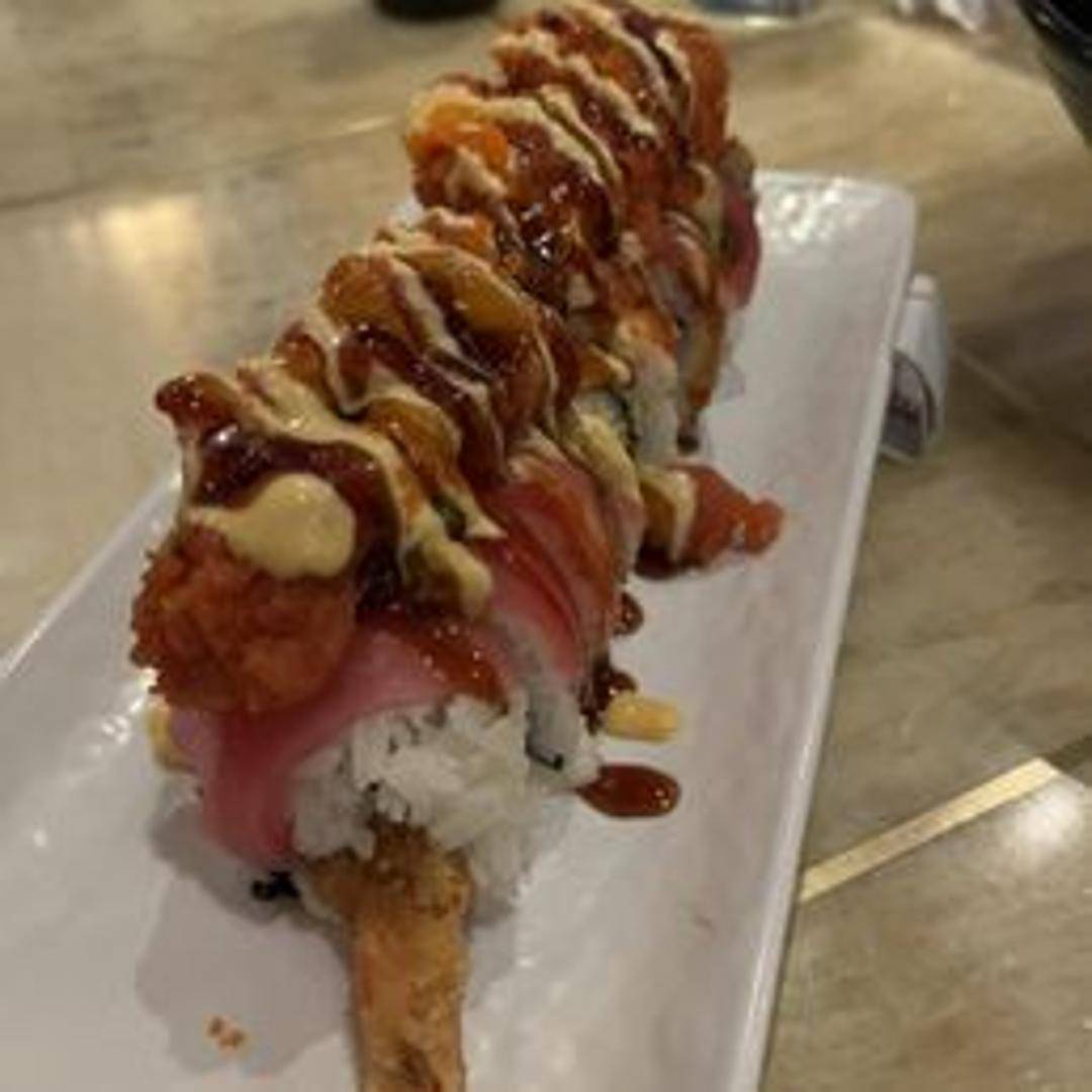 A delectable sushi roll featuring a combination of fresh ingredients and flavorful sauces. Typically includes tempura shrimp, avocado, and cucumber, topped with spicy tuna, a sweet eel sauce, and crunchy tempura flakes.
