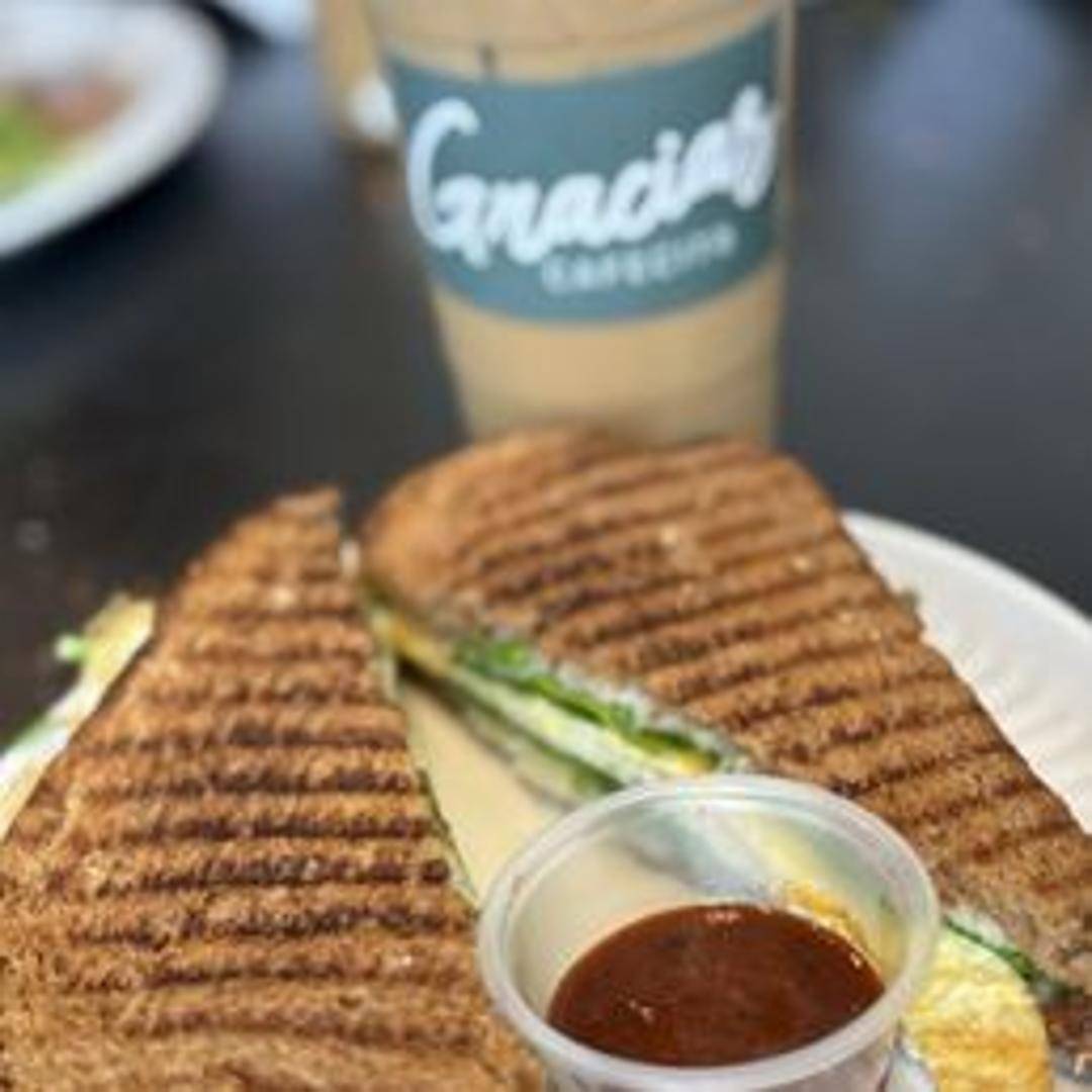 A warm and pressed panini filled with fluffy scrambled eggs, fresh spinach, and melted cheese. A light and healthy breakfast or lunch option.