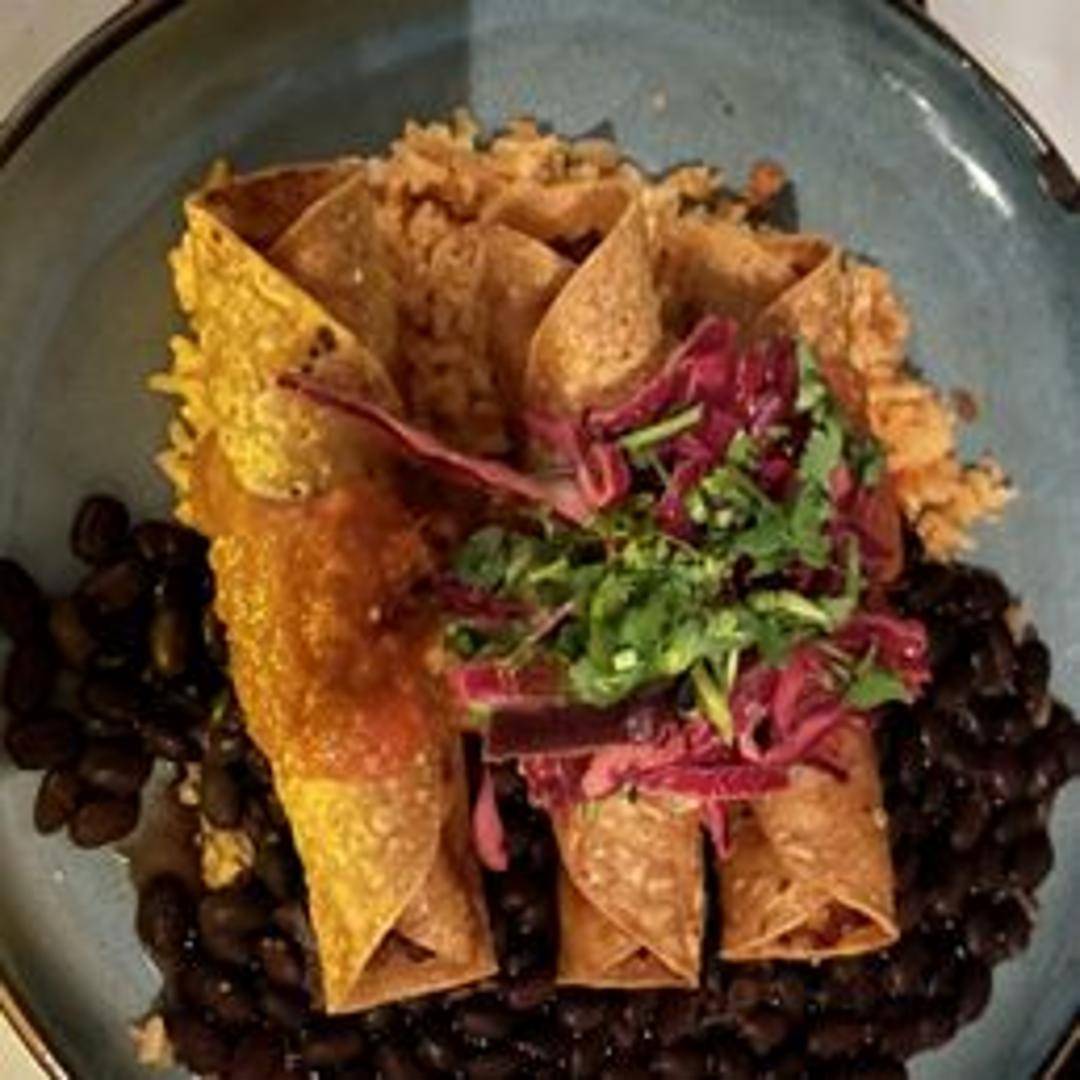 Crispy, rolled tortillas filled with a creamy and slightly sweet mixture of seasoned sweet potato. Topped with cashew crema, pickled onions and cilantro.