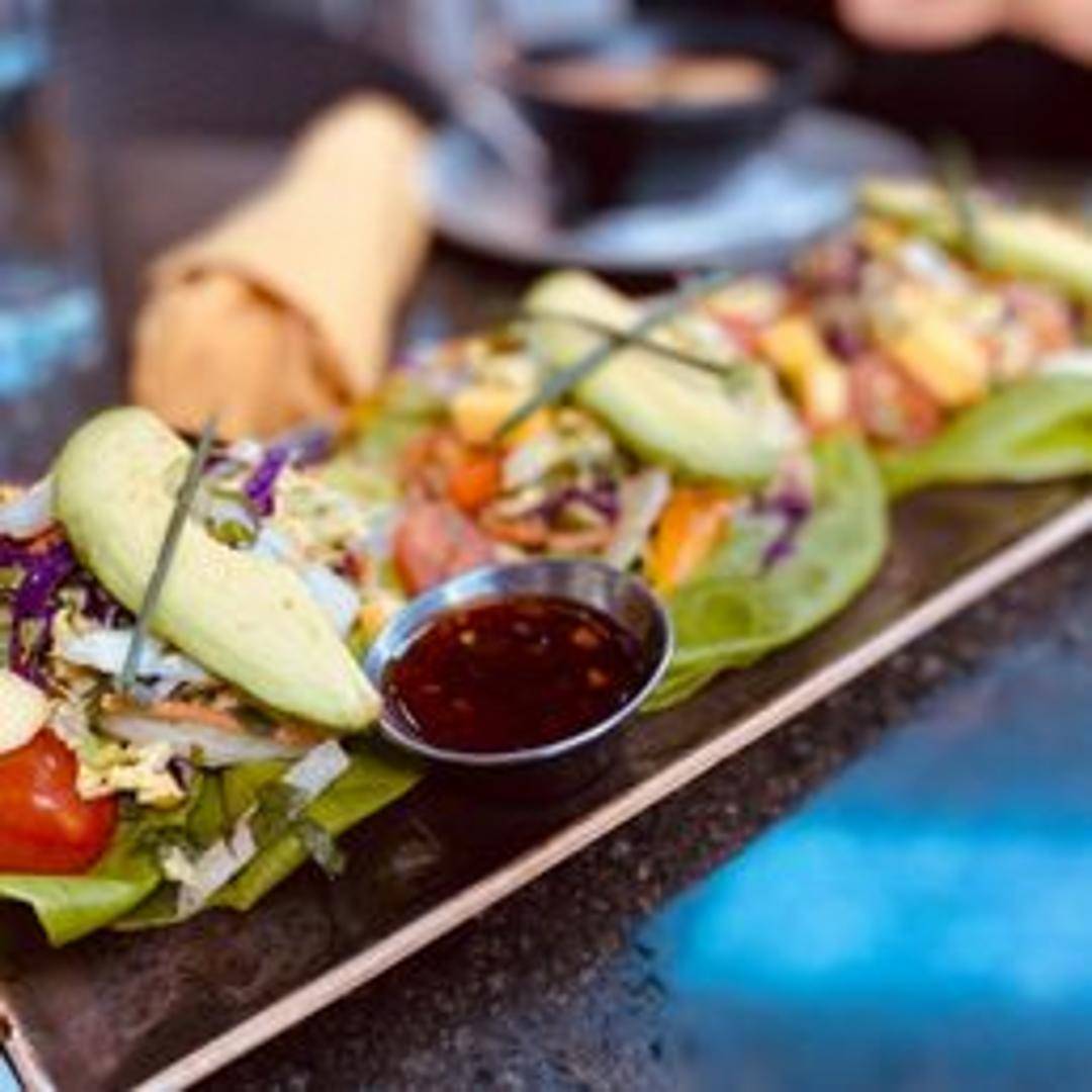 Fresh and crisp lettuce cups filled with a flavorful mixture of seasoned ground meat or tofu, water chestnuts, mushrooms, carrots, and a savory sauce. Garnished with green onions and peanuts.