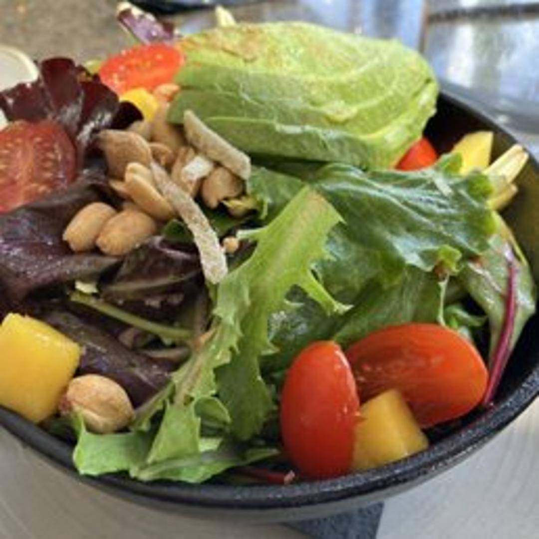A refreshing salad featuring mixed greens, shredded carrots, cucumbers, and other fresh vegetables, tossed in a tangy Thai ginger dressing. May include protein options such as grilled chicken, shrimp, or tofu. Topped with crunchy elements like peanuts, crispy noodles, or sesame seeds.