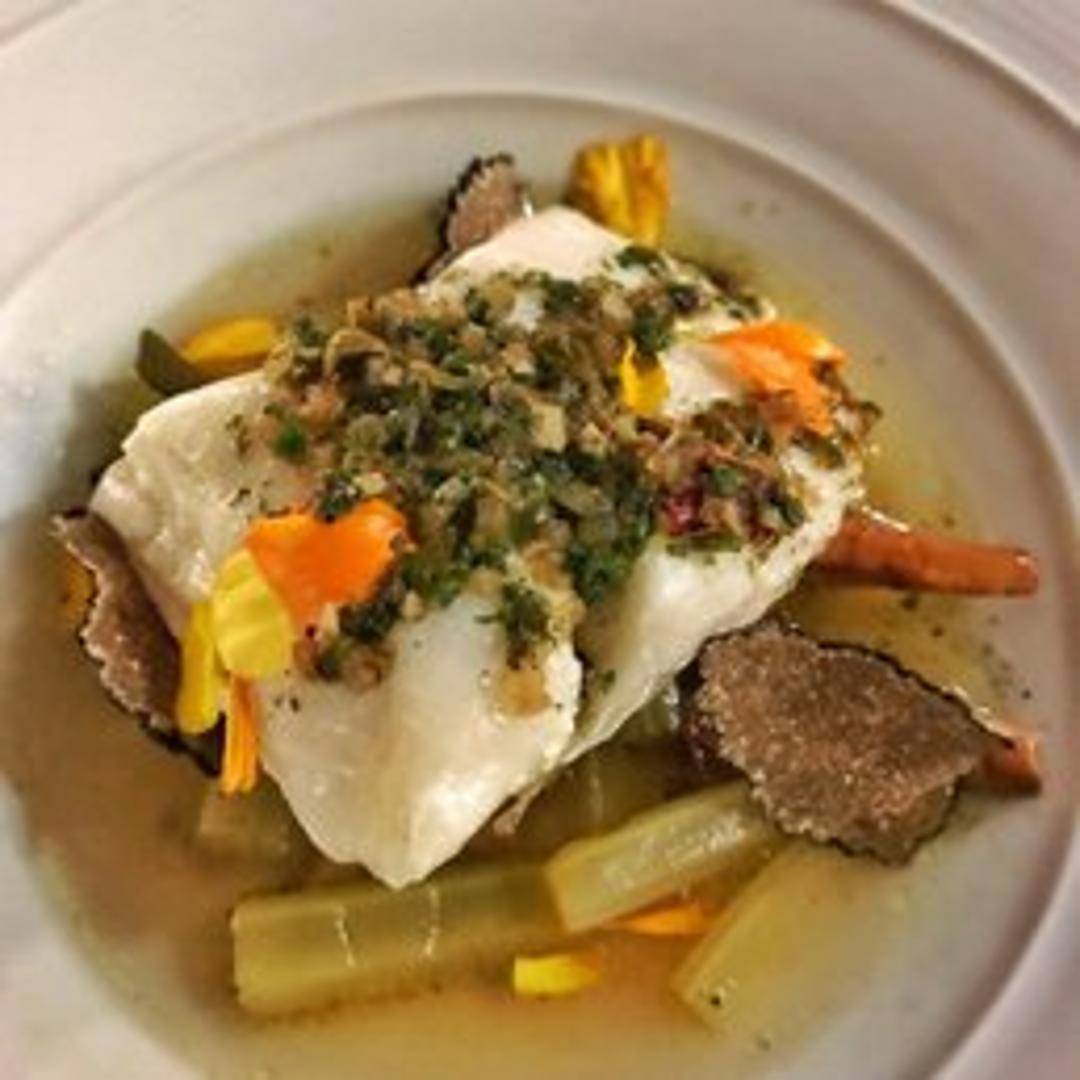 Delicate halibut fillet gently cooked at a low temperature in high-quality olive oil, a technique that ensures the fish remains incredibly moist, flaky, and infused with the nuanced, fruity notes of the oil, resulting in a supremely tender and flavorful main course.