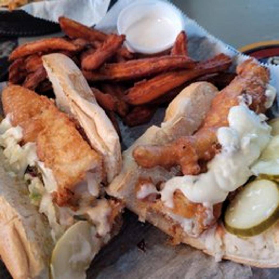 A generous portion of flaky, lightly battered Lake Ontario fish served on a toasted bun with crisp lettuce, ripe tomato, and a tangy tartar sauce. Served with your choice of side.