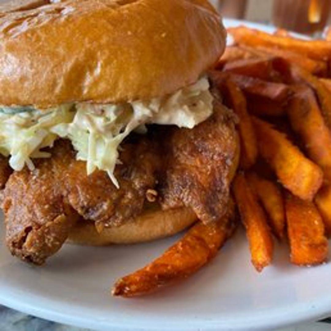 Crispy fried chicken breast on a toasted brioche bun with lettuce, tomato, pickles, and a spicy aioli.