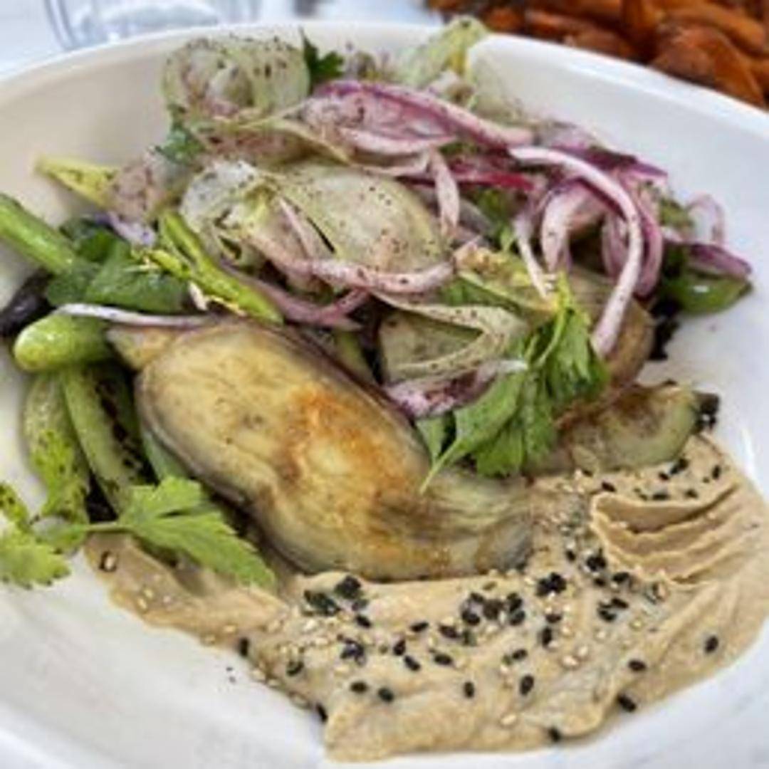 A vibrant and nourishing bowl featuring a medley of seasonal vegetables, grains, and legumes. Typically includes roasted sweet potatoes, quinoa, kale, avocado, toasted seeds, and a flavorful vinaigrette. May contain nuts.