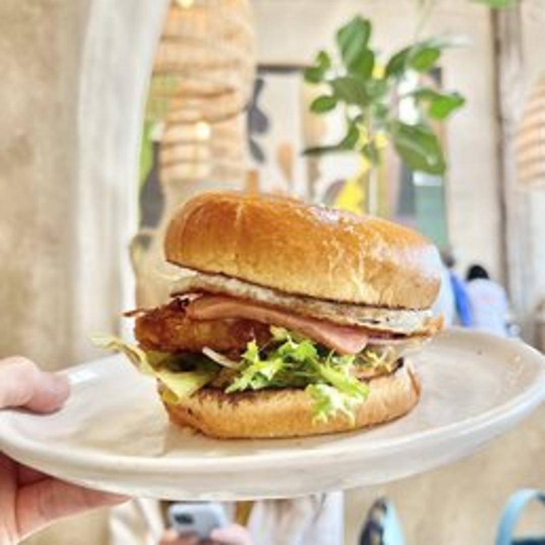 A toasted brioche bun filled with scrambled eggs, crispy bacon, cheddar cheese, and avocado. Served with a side of house-made aioli.