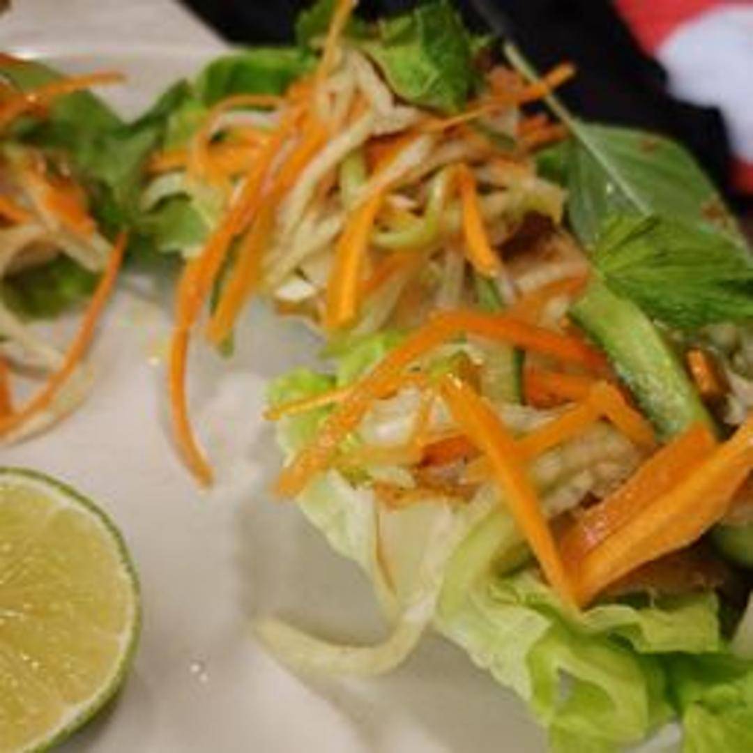 Two soft tortillas filled with grilled or fried fish, shredded cabbage, pico de gallo, and a tangy sauce. Served with lime wedges.