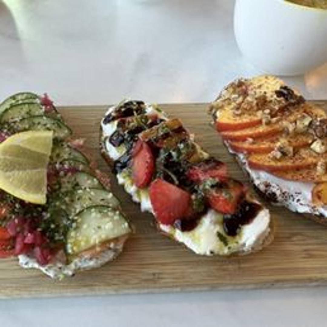Open-faced toast with cream cheese, thinly sliced smoked salmon, red onion, capers, and a squeeze of lemon. A classic and satisfying choice.