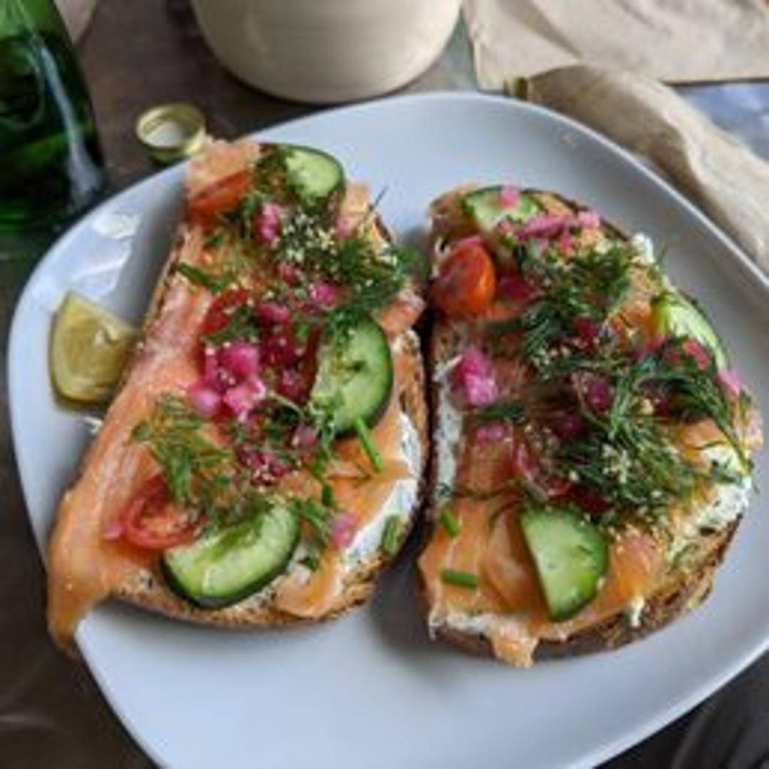 Local artisan bread layered with cream cheese, thinly sliced Colorado-sourced smoked salmon, everything bagel seasoning, tomato slices, and fresh dill. A regional twist on a classic.