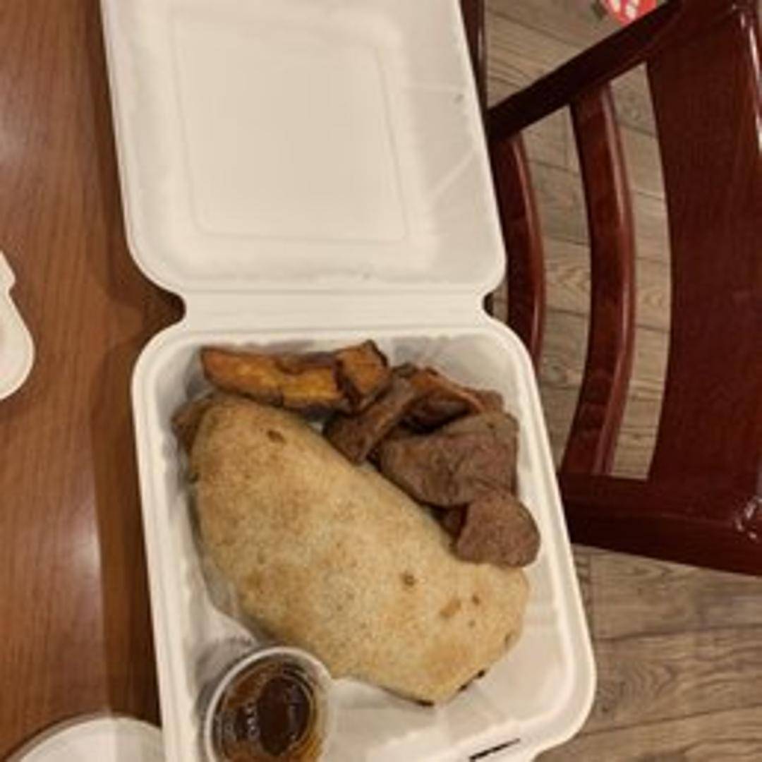A large flour tortilla filled with seasoned rice, black beans, sauteed peppers and onions, corn, guacamole, salsa, and your choice of sour cream or vegan sour cream.