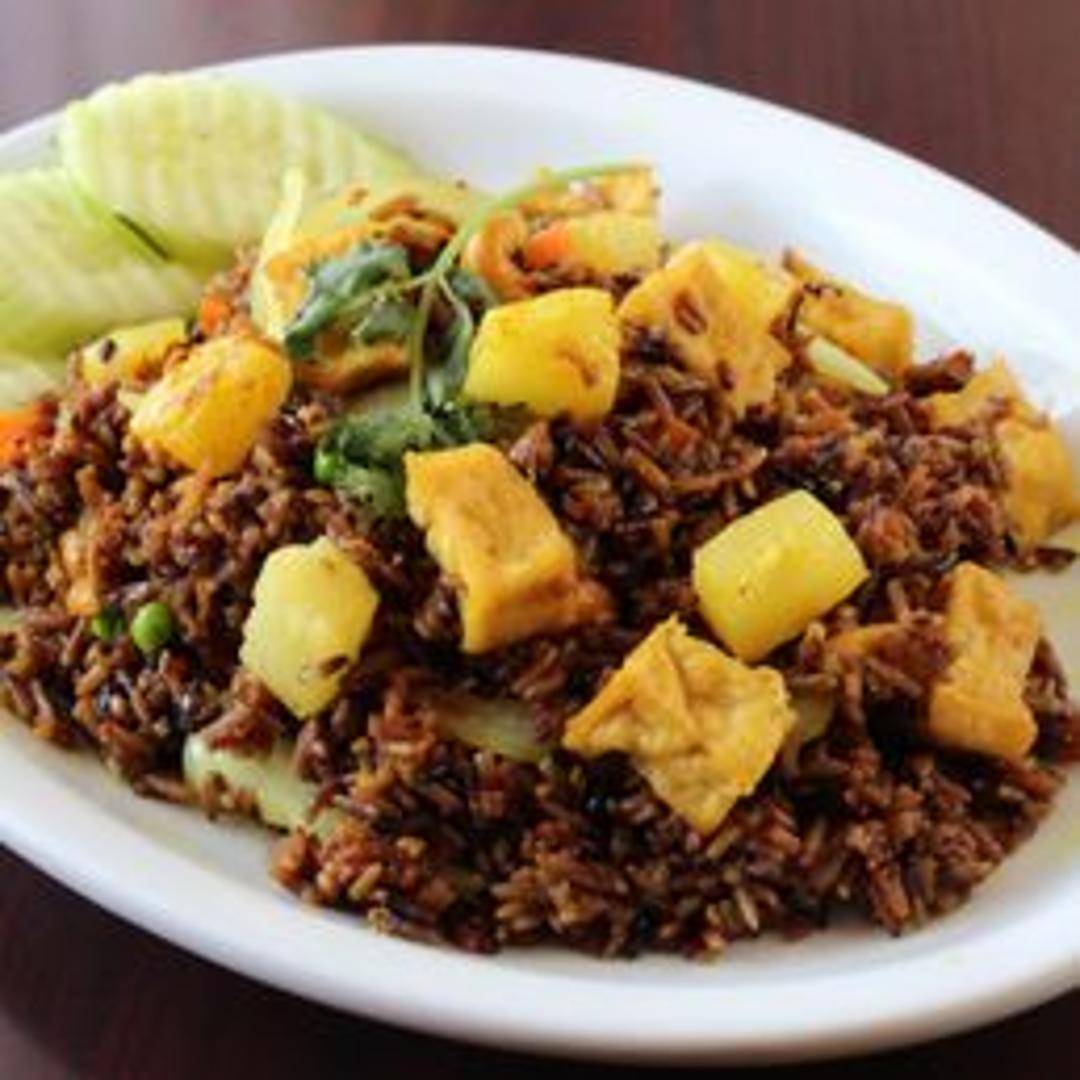 Savory and sweet fried rice with pineapple chunks, cashews, raisins, peas, carrots, and your choice of protein (tofu, vegetables, or soy chicken).