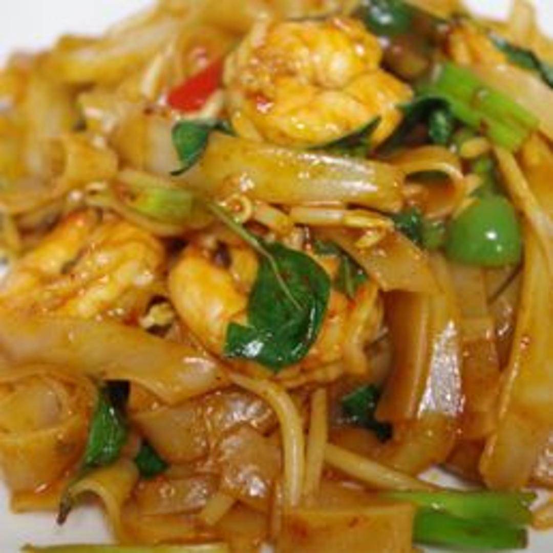 Wide rice noodles stir-fried with your choice of protein, chili peppers, garlic, onions, bell peppers, tomatoes, basil, and a savory drunken noodle sauce.