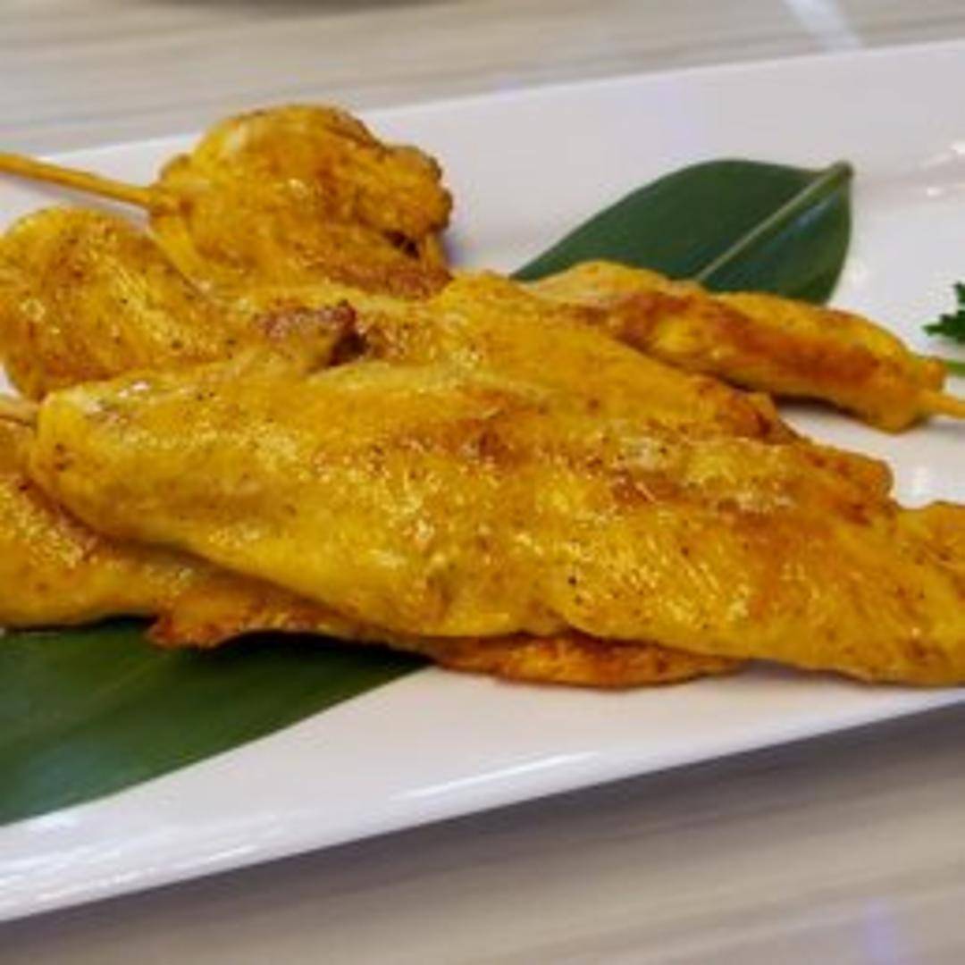 Grilled marinated chicken skewers served with a rich and creamy peanut sauce. A popular appetizer with savory and nutty flavors.
