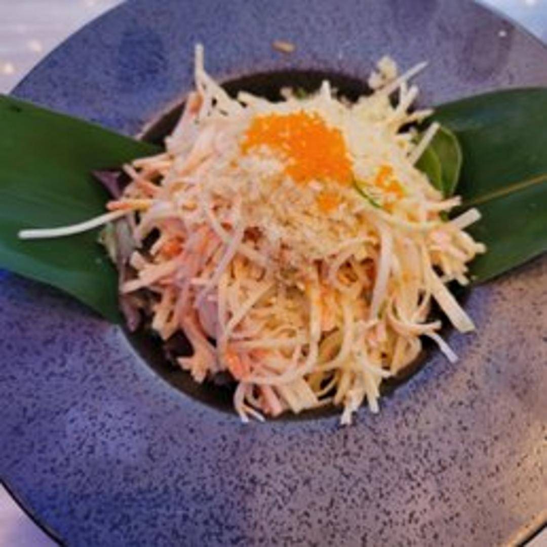 A refreshing and flavorful salad featuring shredded imitation crab meat (kani kama), often blended with crisp cucumber, mango, and a creamy Japanese mayonnaise-based dressing. May contain masago (fish roe) for added texture and flavor. A light and delicious appetizer or side dish.