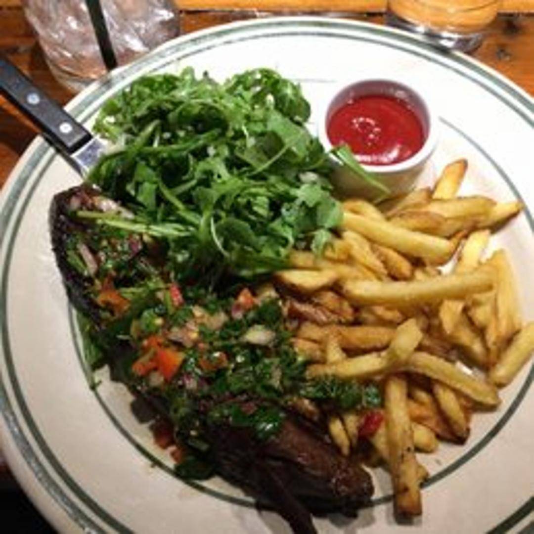 A flavorful and tender cut of beef, expertly grilled or pan-seared to your preferred doneness. Known for its robust, beefy taste, the hanger steak is typically served sliced and accompanied by a complementary sauce, such as a rich jus or a vibrant chimichurri, alongside seasonal vegetables or potatoes.