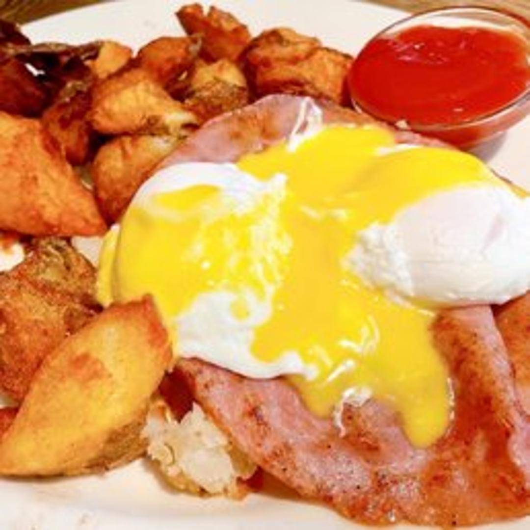 Enjoy the classic perfection of our Eggs Benedict. Two perfectly poached eggs rest atop toasted English muffins and slices of savory Canadian bacon, all generously draped with a rich, velvety hollandaise sauce. A timeless and elegant brunch offering that promises a burst of flavor in every bite.