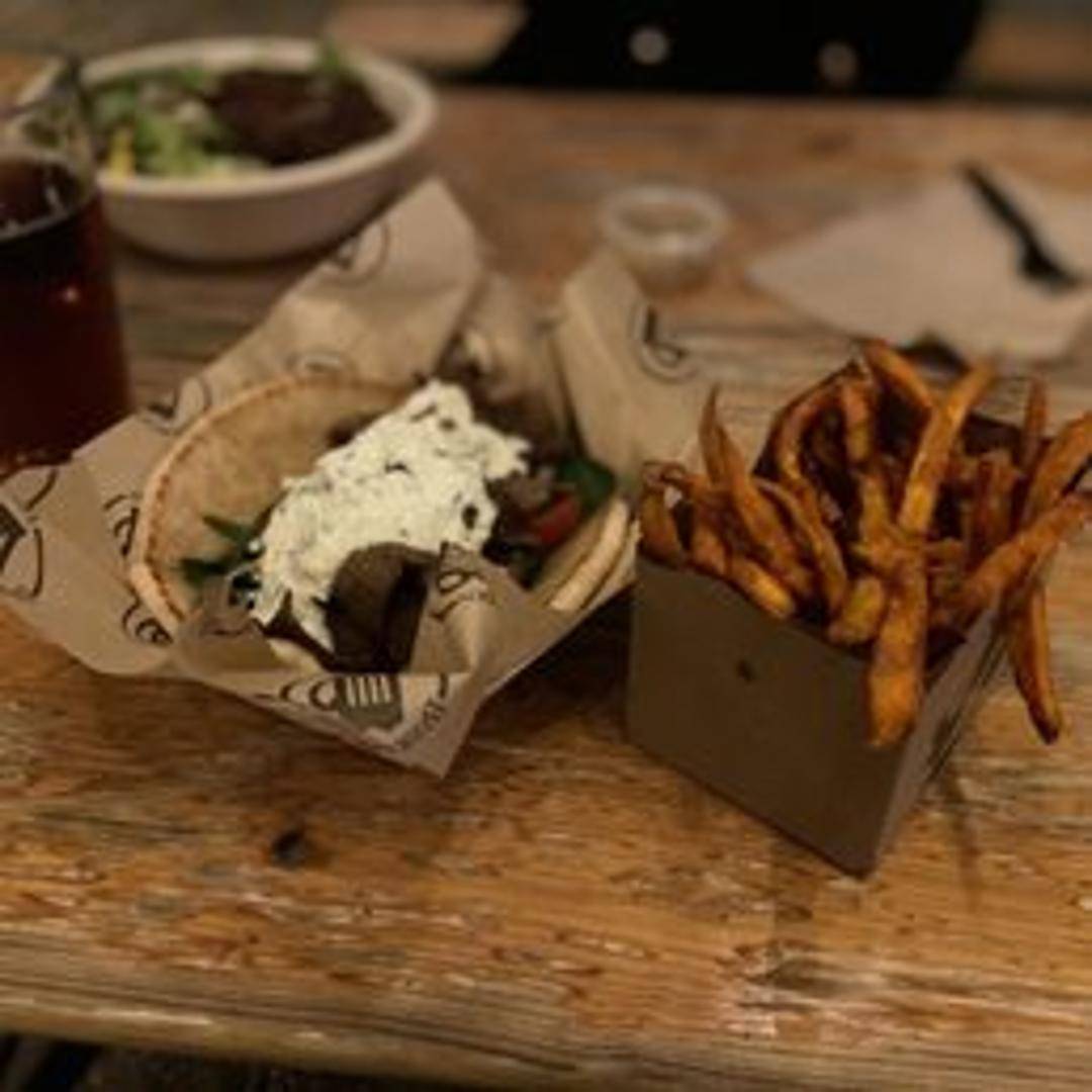Seasoned gyro meat shaved from a vertical rotisserie, served in a warm pita bread with tomatoes, onions, and creamy tzatziki sauce.