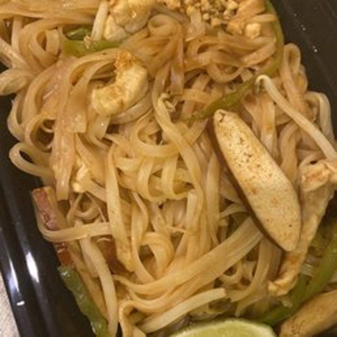 A classic Thai stir-fried noodle dish with rice noodles, shrimp (or other protein of your choice), bean sprouts, scrambled egg, and peanuts in a tangy-sweet tamarind sauce. Garnished with lime wedges and ground peanuts.