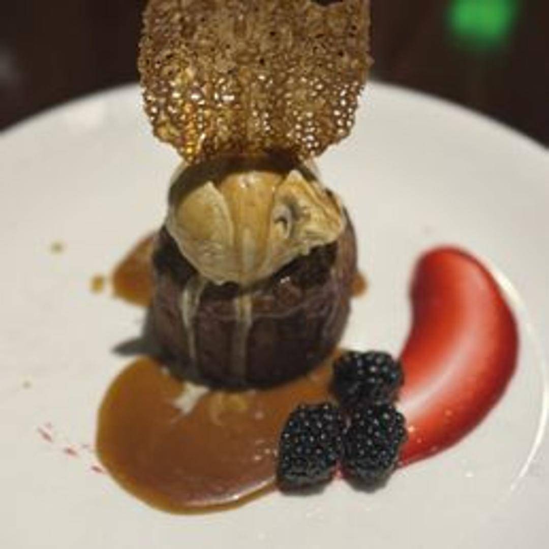 Warm, moist sticky toffee cake served with vanilla ice cream and toffee sauce.