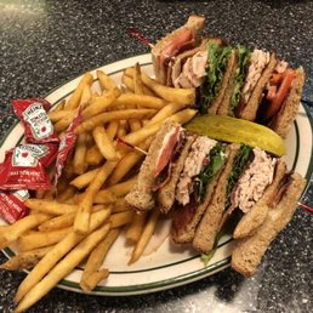 Stacked high with sliced turkey, bacon, lettuce, tomato, and mayonnaise on toasted bread.