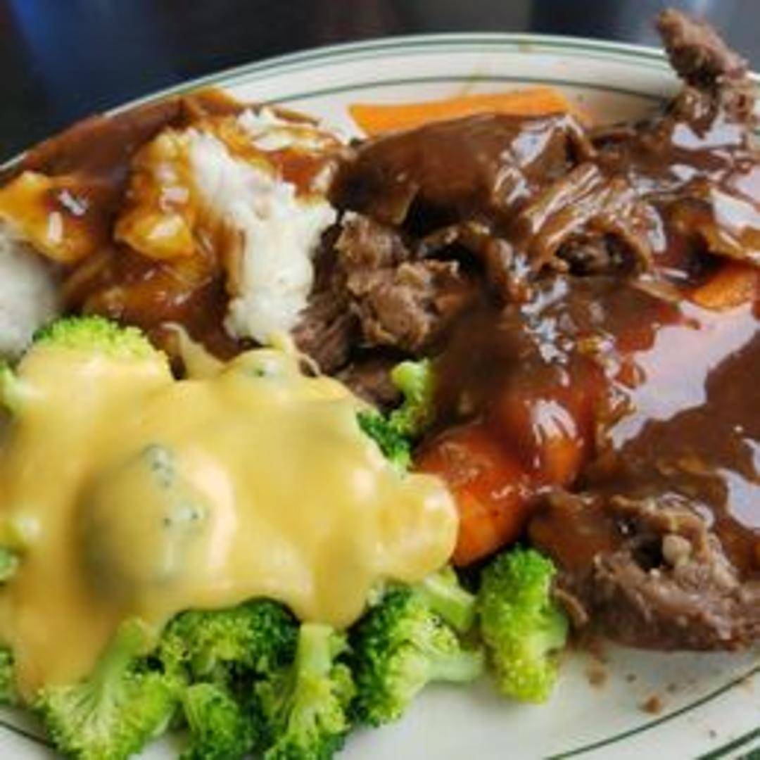 Tender, slow-cooked pot roast served with carrots, potatoes, and a rich gravy.