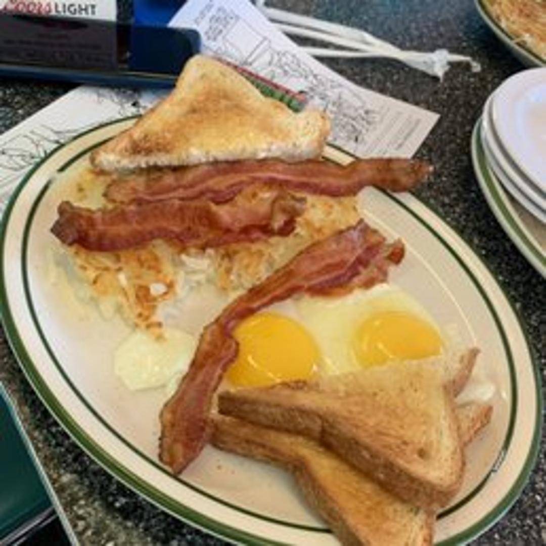 A hearty breakfast platter featuring multiple eggs, a selection of breakfast meats (such as bacon, sausage, or ham), potatoes (hash browns or country potatoes), and toast or pancakes.