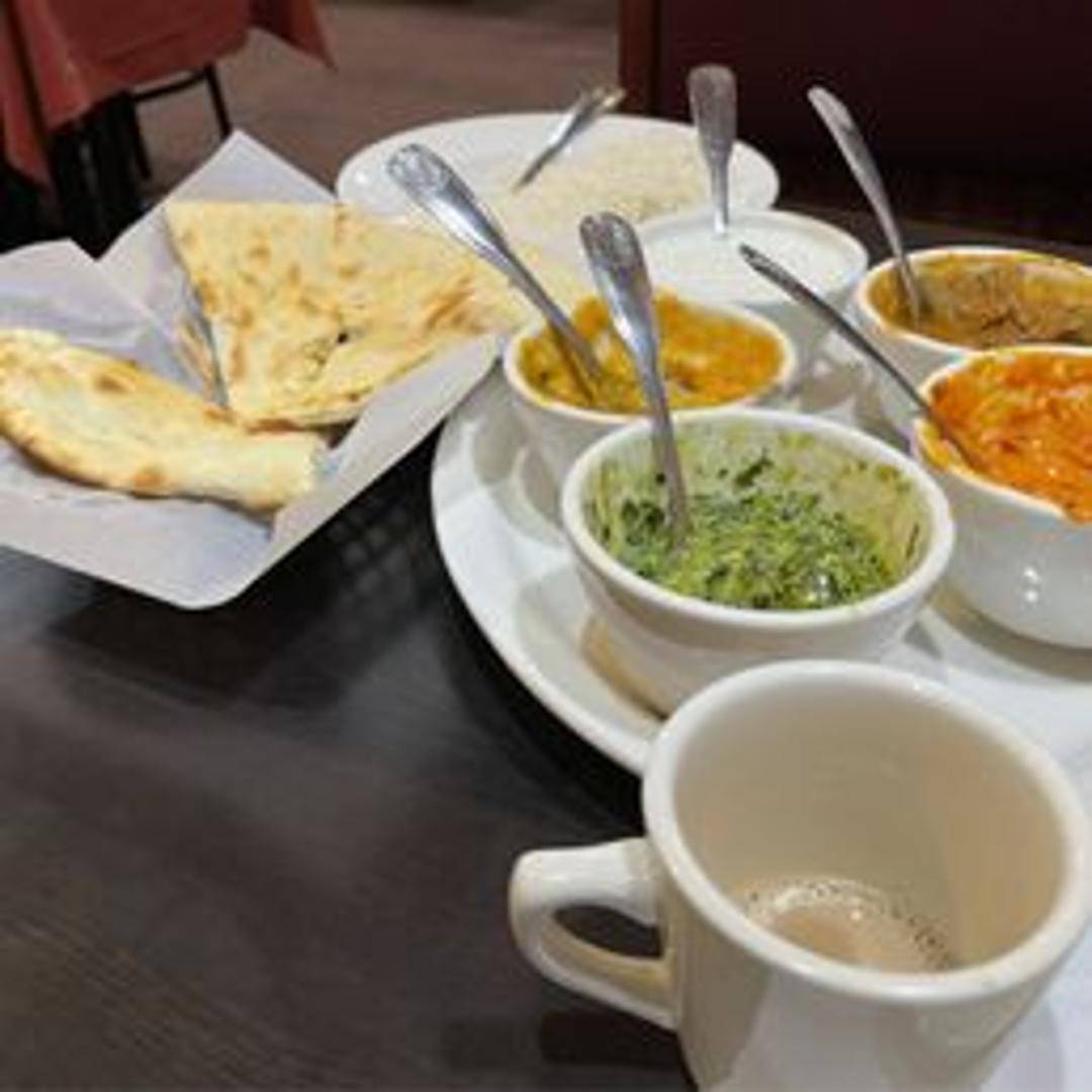A complete and satisfying Indian meal featuring a variety of non-vegetarian dishes. This Thali typically includes a meat curry (such as chicken or lamb), dal (lentil soup), vegetable curry, rice, naan bread, yogurt (raita), salad, and a sweet dessert. The exact selection may vary.