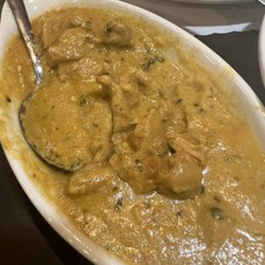 A rich and creamy chicken curry made with yogurt, cream, nuts (almonds, cashews), and aromatic spices like cardamom, cinnamon, and cloves. It is a mildly spiced dish with a delicate and flavorful sauce, typically served with rice or naan bread.