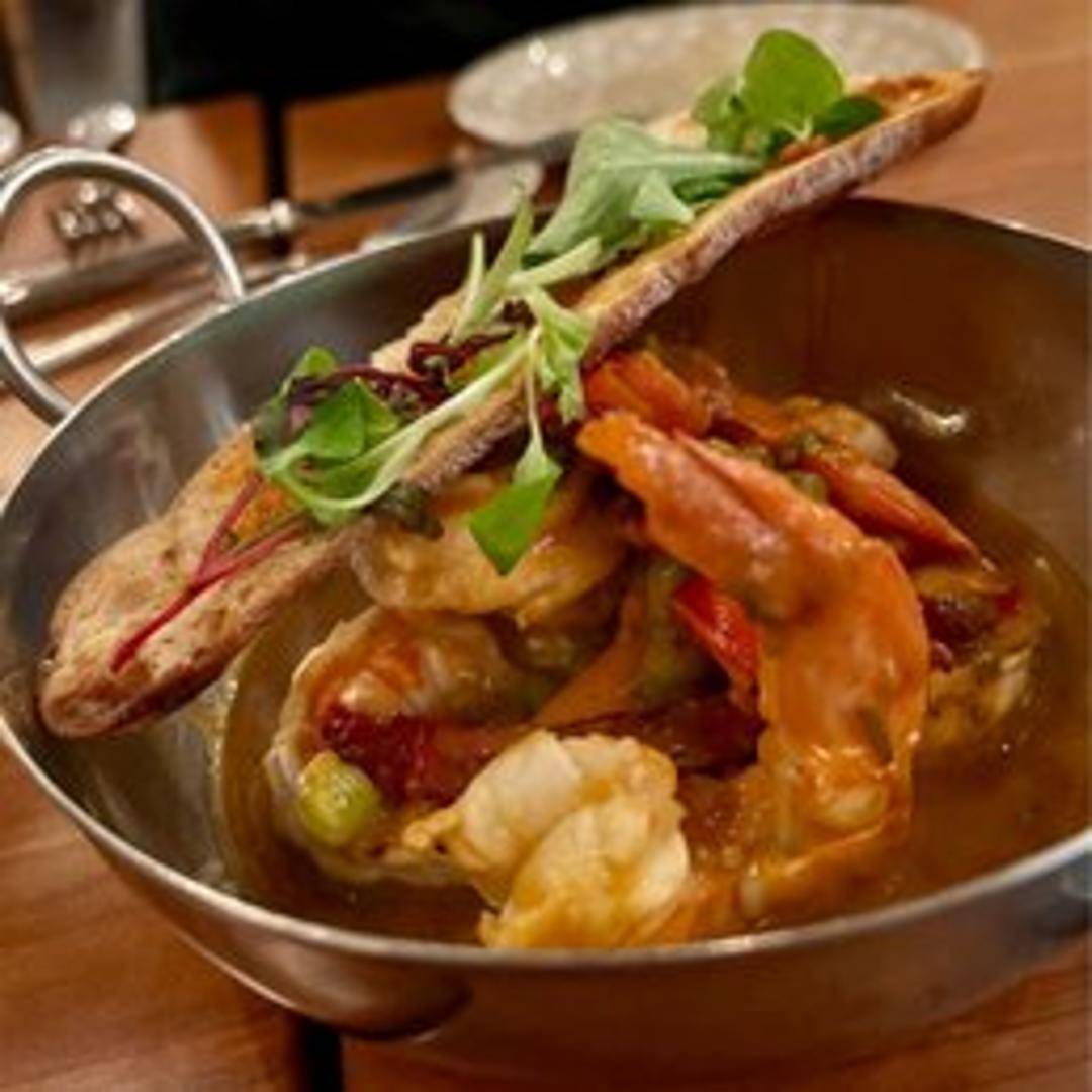 Succulent large shrimp sizzling in a fragrant bath of extra virgin olive oil, infused with garlic, a hint of chili, and fresh parsley, perfect for dipping with crusty bread.
