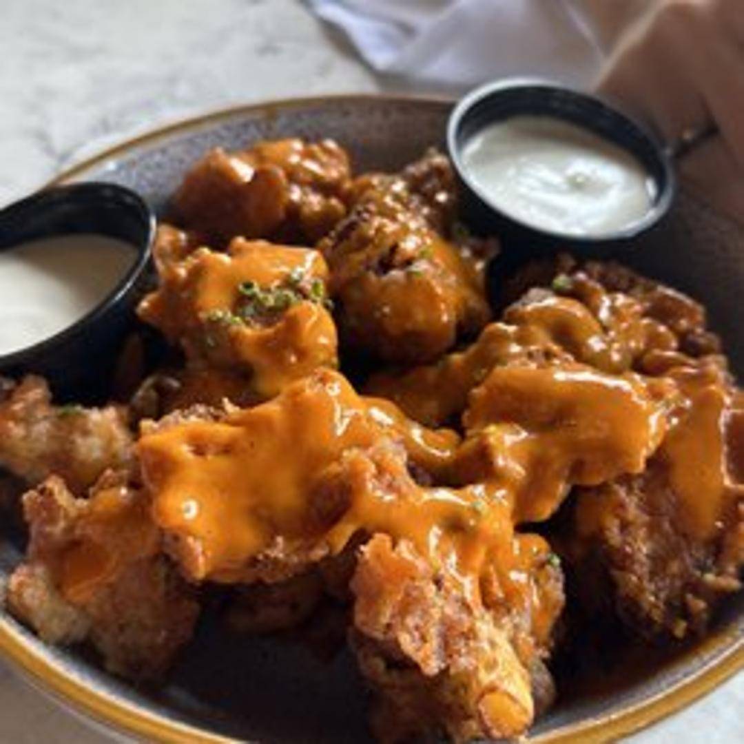 Crispy cauliflower florets tossed in a tangy and spicy buffalo sauce, served with a side of cooling dipping sauce (usually ranch or blue cheese).