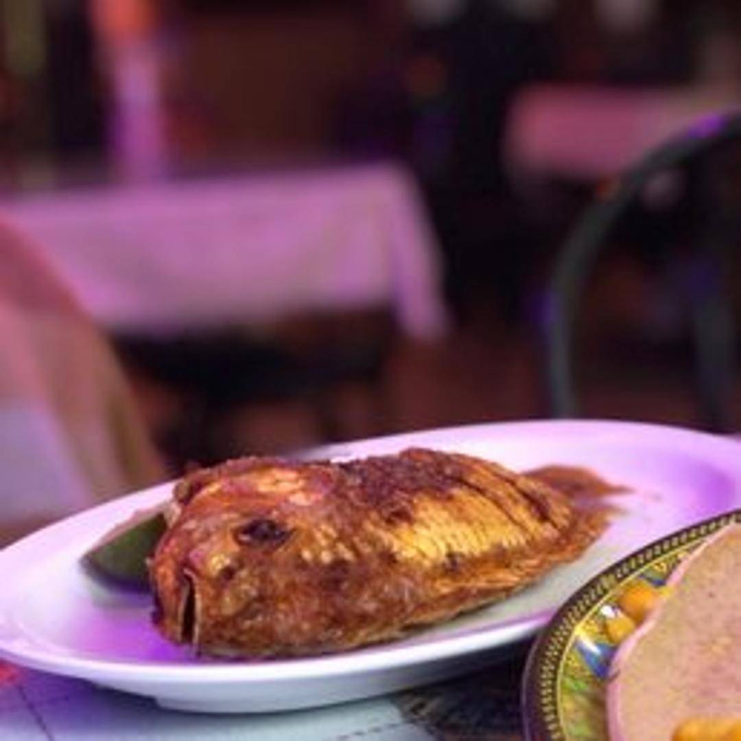 A whole, crispy fried tilapia served alongside Habesha Salad, a refreshing mix of greens, tomatoes, onions, and a tangy vinaigrette dressing.