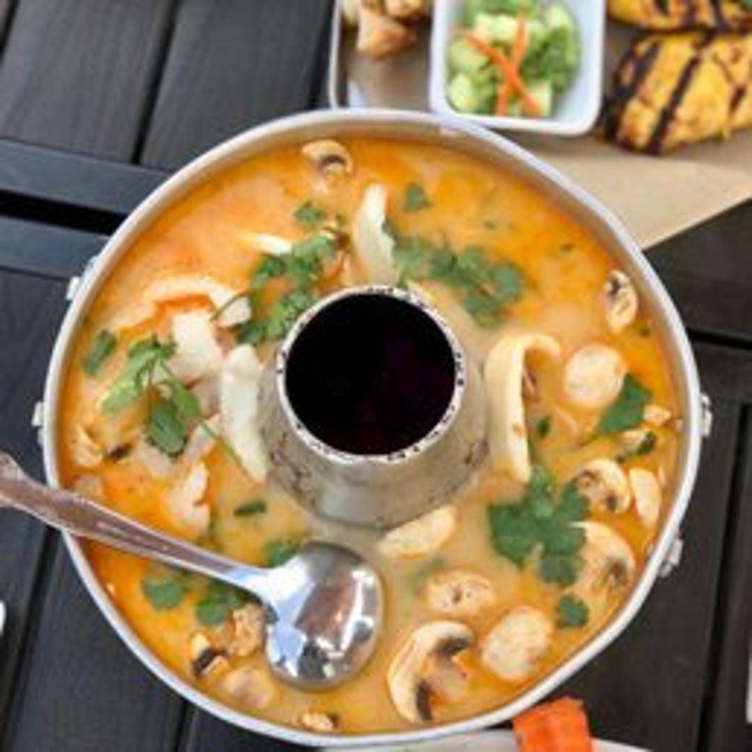 A creamy and aromatic coconut milk soup with lemongrass, galangal, kaffir lime leaves, mushrooms, tomatoes, and your choice of protein (chicken, shrimp, tofu, or vegetables). Garnished with cilantro and chili oil.