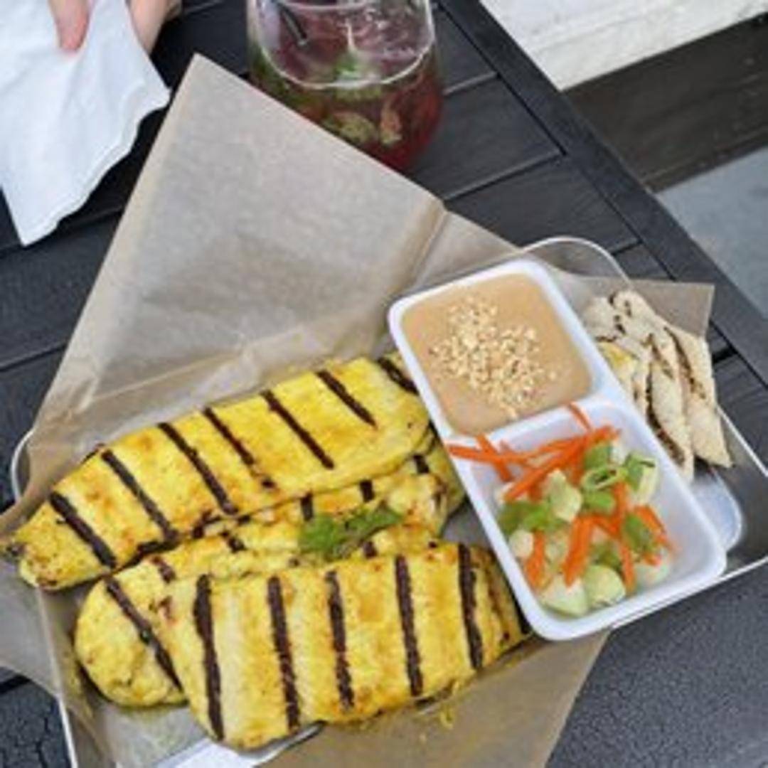 Grilled marinated chicken skewers served with a creamy peanut sauce and cucumber relish.