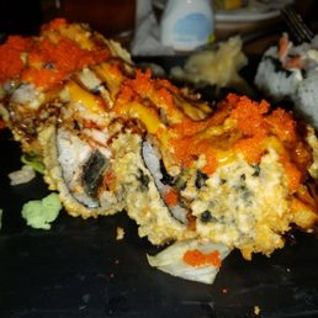 A visually stunning and flavorful sushi roll featuring a base of California roll (crab stick, avocado, cucumber) topped with slices of avocado arranged to resemble dragon scales. Often drizzled with eel sauce and spicy mayo for a sweet and savory combination. May contain sesame seeds.