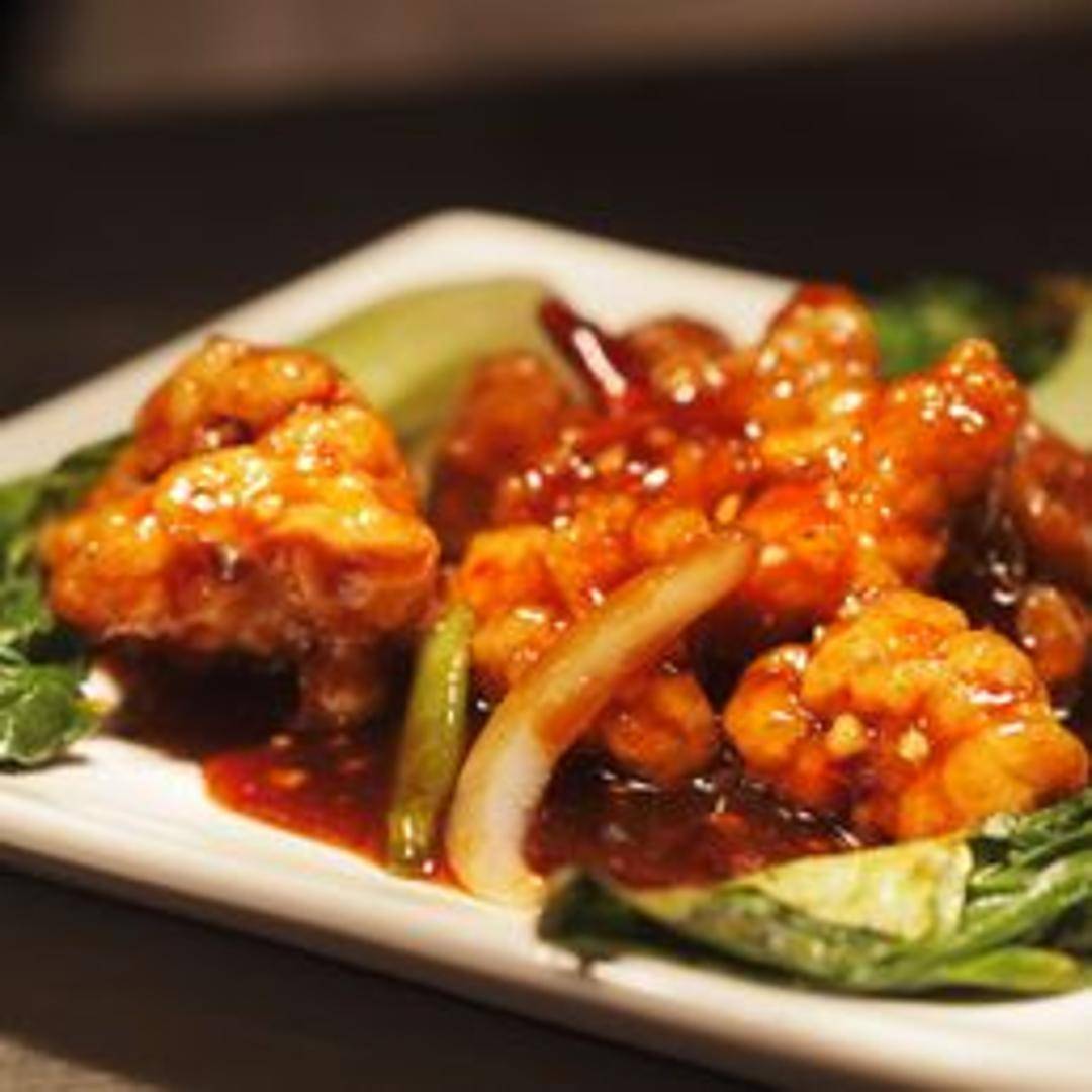 Tender, bite-sized pieces of chicken, lightly battered and stir-fried in a sweet and spicy General Tso sauce. Served with steamed rice.