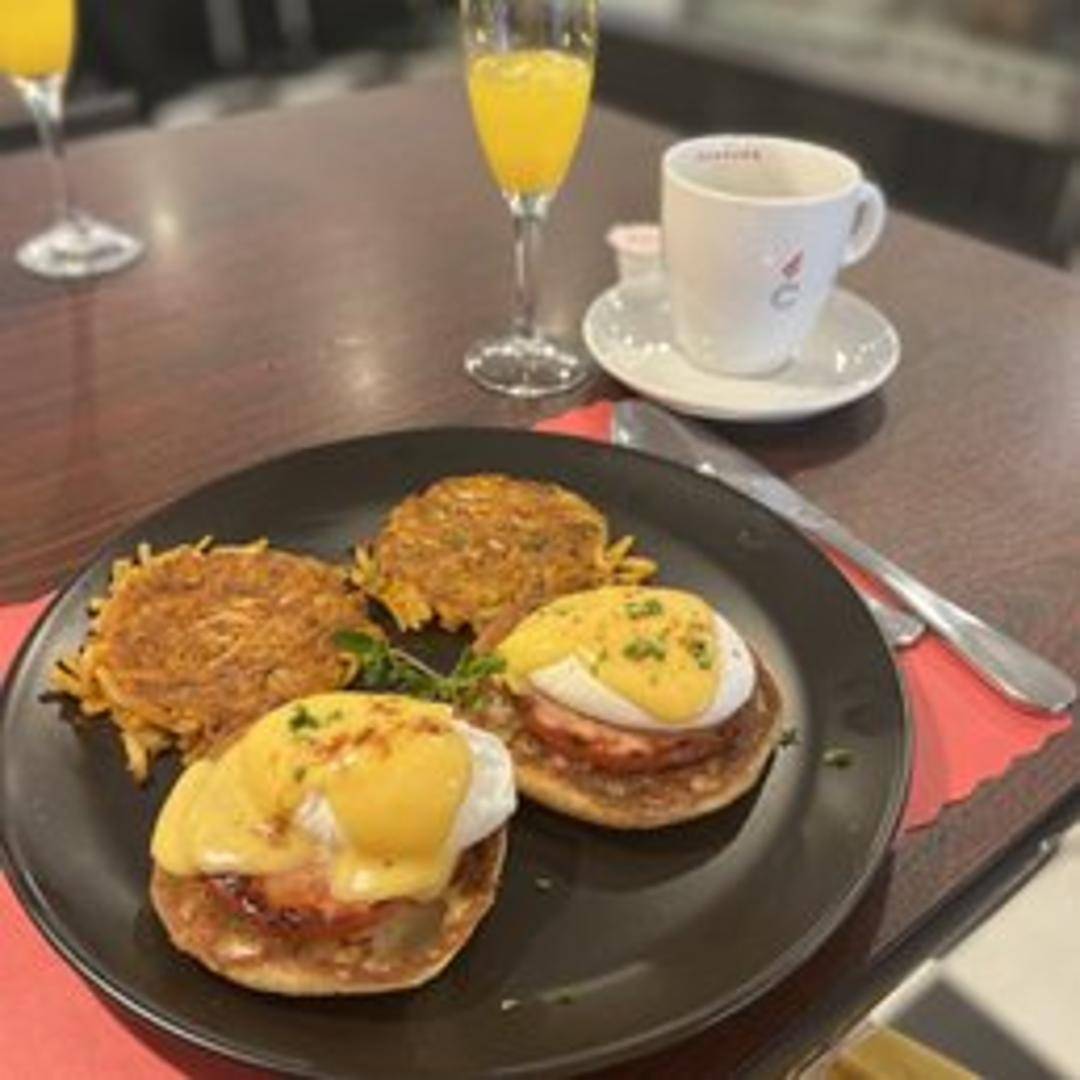 Two poached eggs served on toasted English muffins with Canadian bacon and topped with a classic hollandaise sauce. Served with a side of breakfast potatoes.