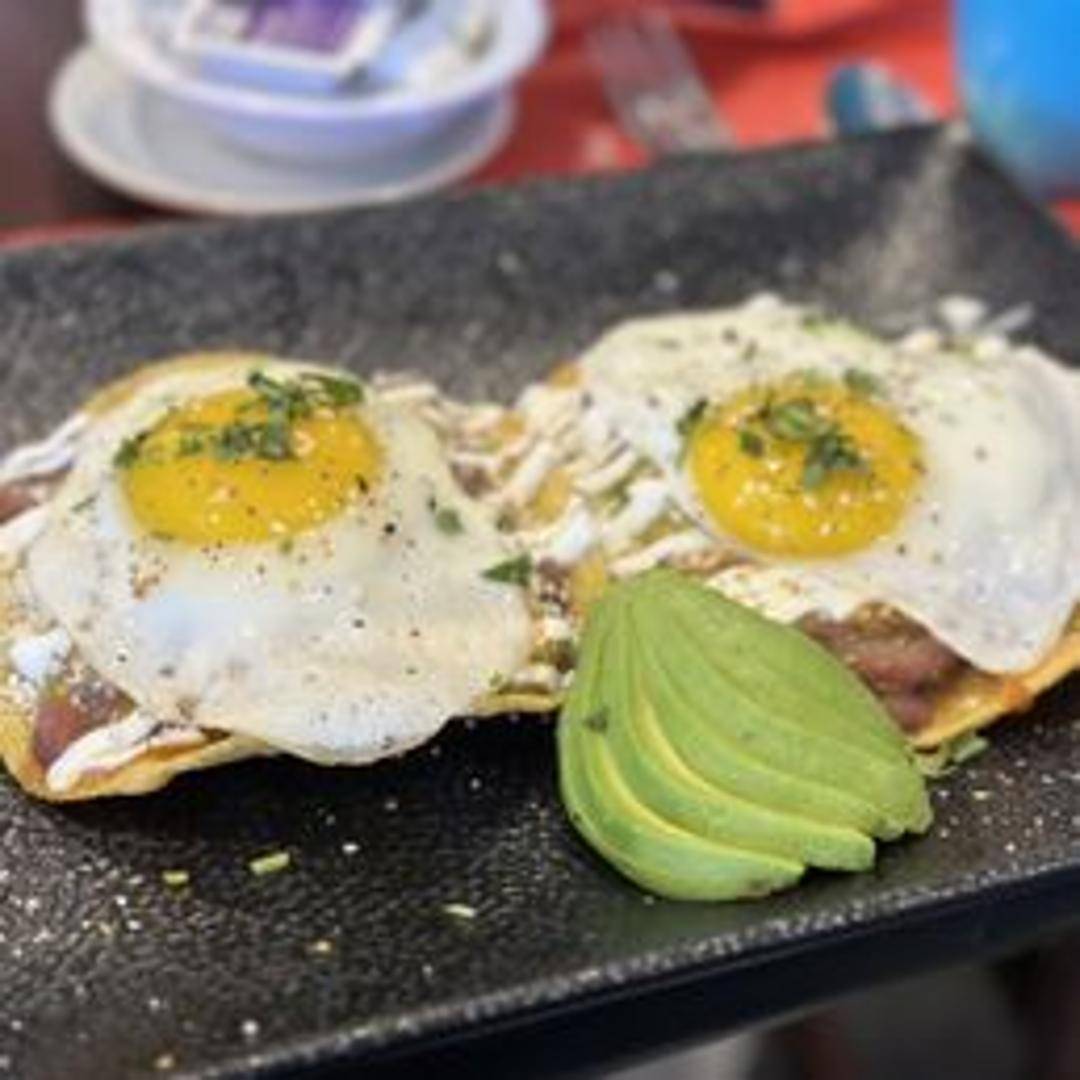 Two fried eggs served atop crispy corn tortillas, smothered in a vibrant ranchero sauce, refried beans, melted cheddar cheese, and topped with fresh pico de gallo and a dollop of sour cream.