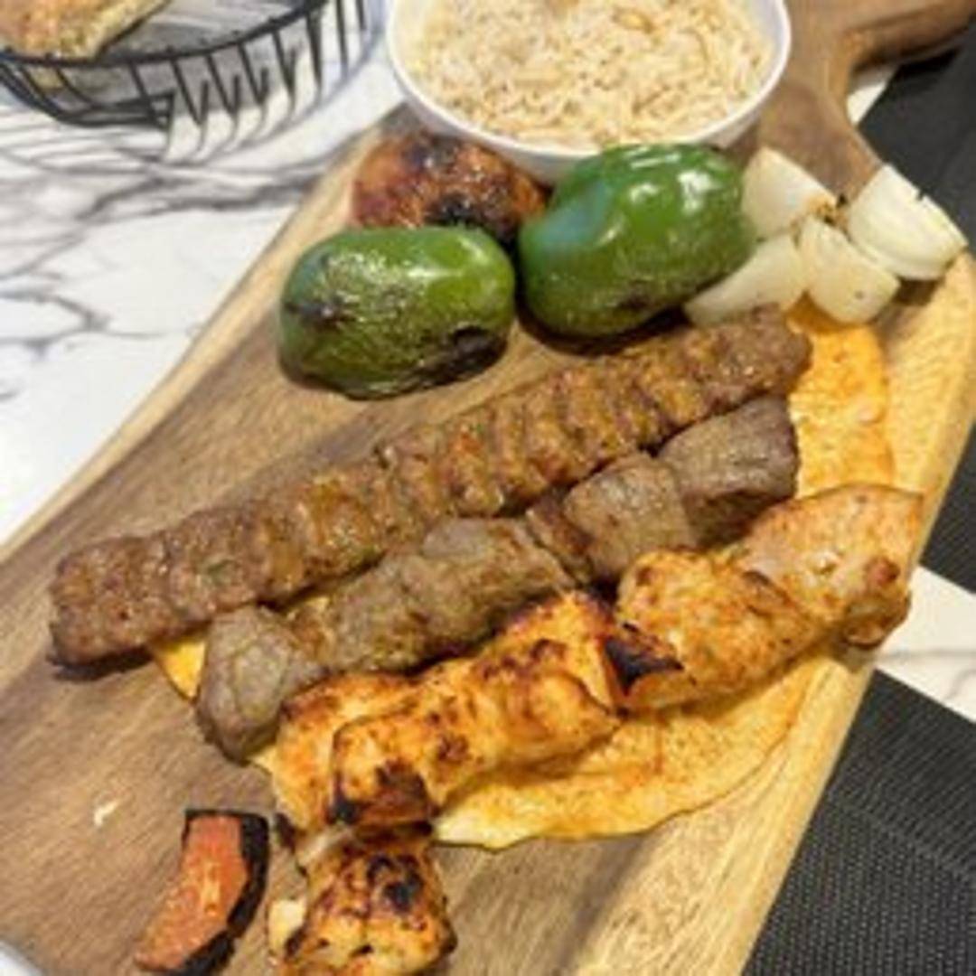 A combination platter featuring three different types of kebab or grilled meats. A generous serving that allows you to sample a variety of flavors and textures. May include beef, chicken, lamb, or other specialty kebabs. Served with rice, salad, or other accompaniments.