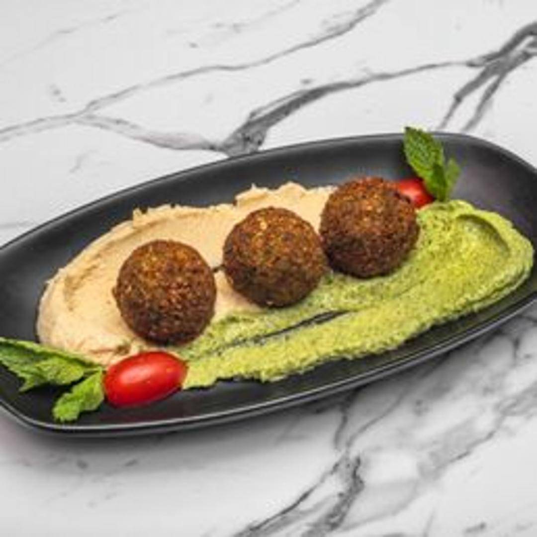 A generous serving of crispy falafel, accompanied by hummus, tahini sauce, Israeli salad, and pita bread.
