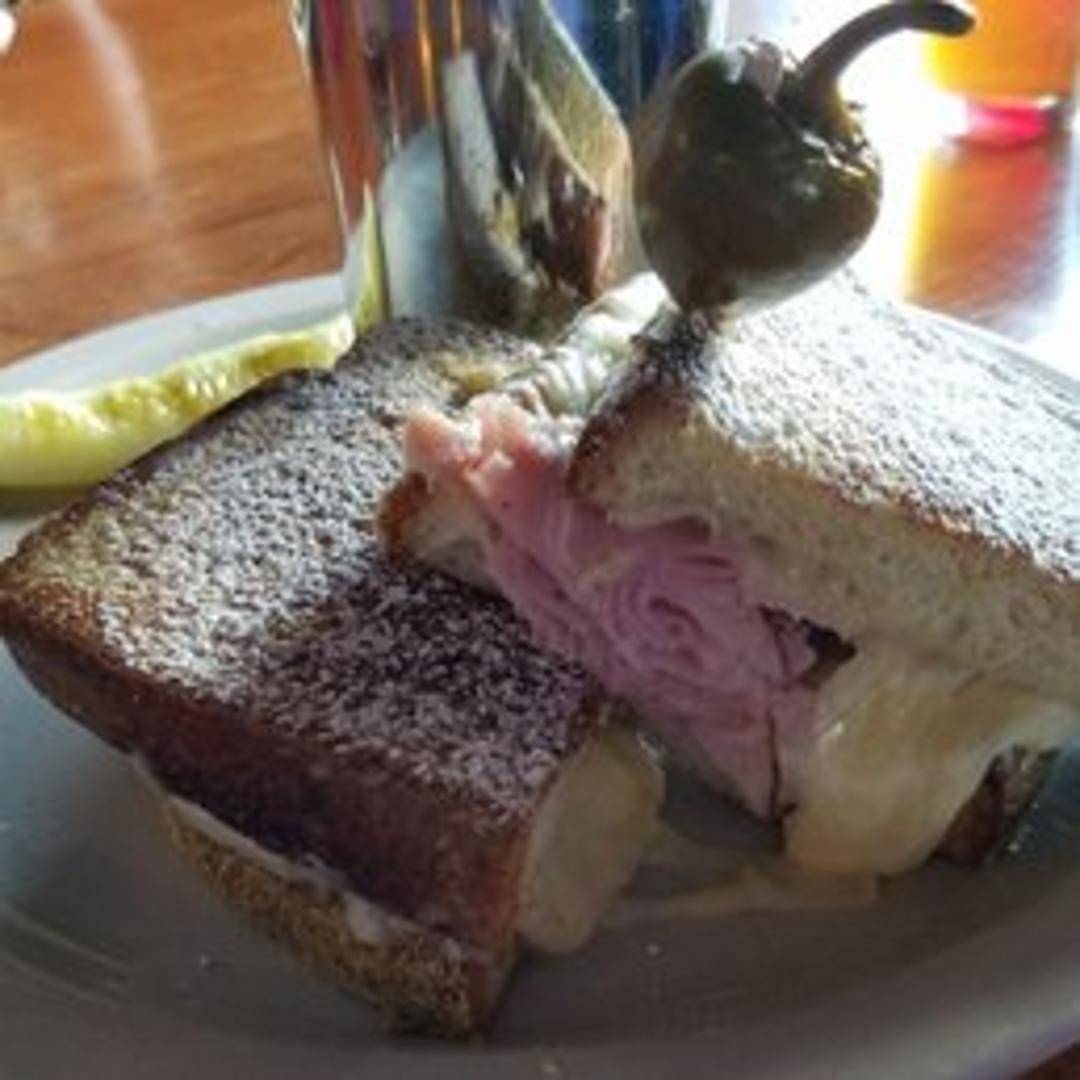 Ham, turkey, Swiss, and provolone cheeses grilled between two slices of sourdough bread, battered, and deep-fried until golden brown. Served with a side of strawberry jam.