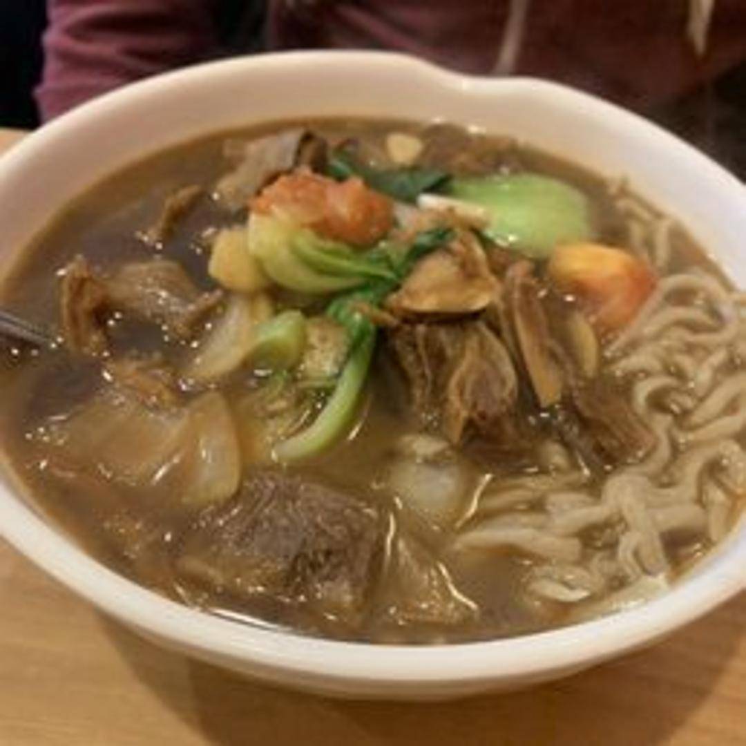 A comforting and hearty bowl featuring tender slices of slow-cooked beef, fresh hand-pulled noodles, and crisp green vegetables, all submerged in a rich, savory beef broth, traditionally seasoned with aromatic spices for a deeply satisfying flavor.