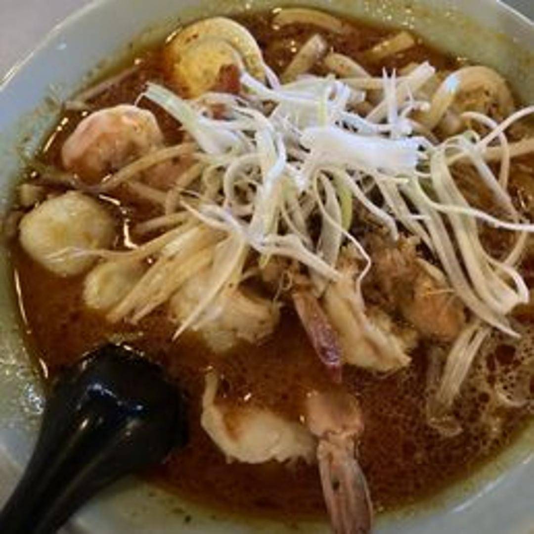 A spicy and aromatic coconut curry noodle soup with a variety of seafood, including shrimp, mussels, and fish, garnished with fresh herbs and vegetables.