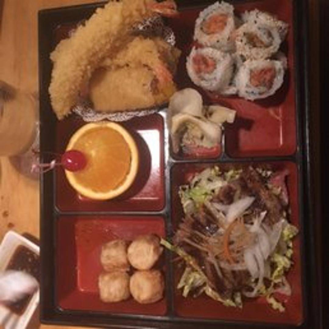 A complete and balanced meal in a box! Our Bento Box typically includes a variety of items such as: grilled teriyaki chicken or salmon, assorted tempura (vegetables and/or shrimp), California roll, rice, and a side salad. Contents may vary.