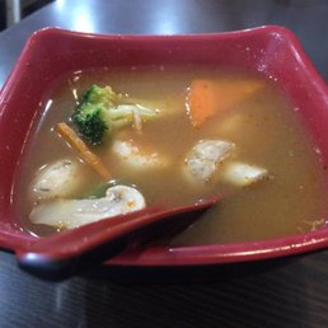 A hot and sour Thai soup with shrimp or chicken, mushrooms, tomatoes, lemongrass, galangal, kaffir lime leaves, and chili peppers. Flavored with fish sauce and lime juice.