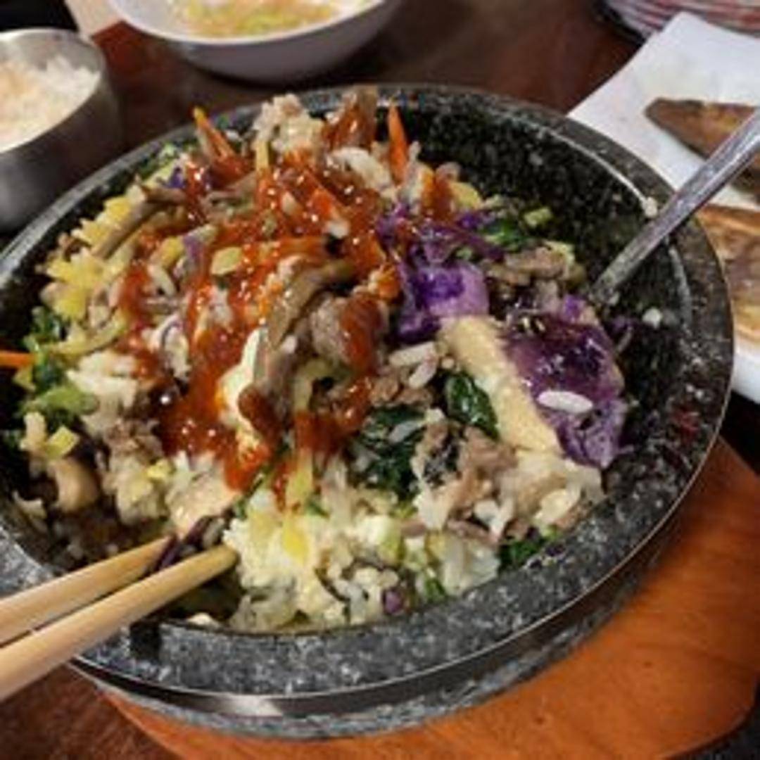 A colorful and savory rice bowl served in a hot stone pot. Topped with seasoned vegetables, a fried egg, and your choice of protein (typically beef). Served with a side of gochujang (red pepper paste) for mixing.