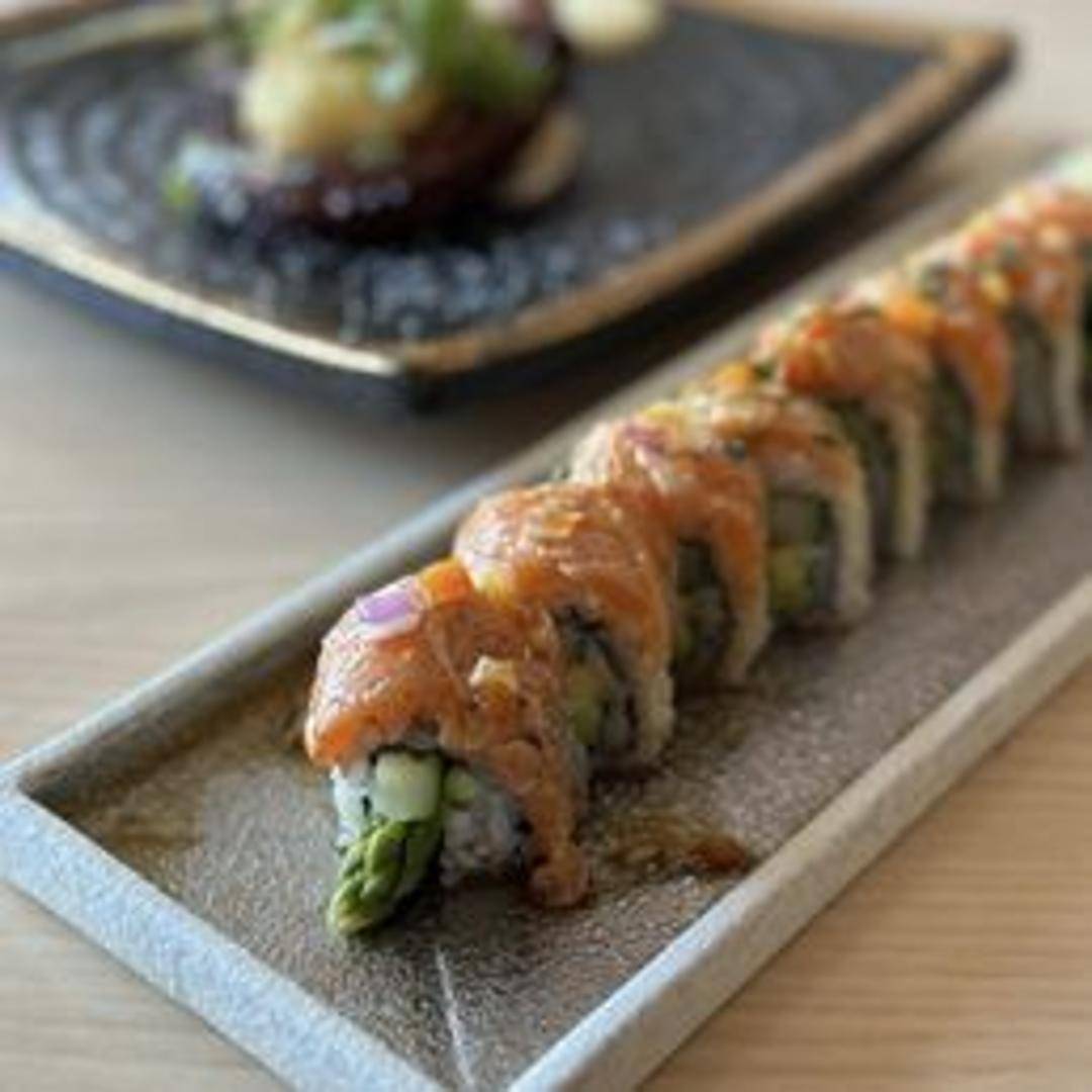 A simple and classic sushi roll filled with fresh salmon, wrapped in nori seaweed and sushi rice.