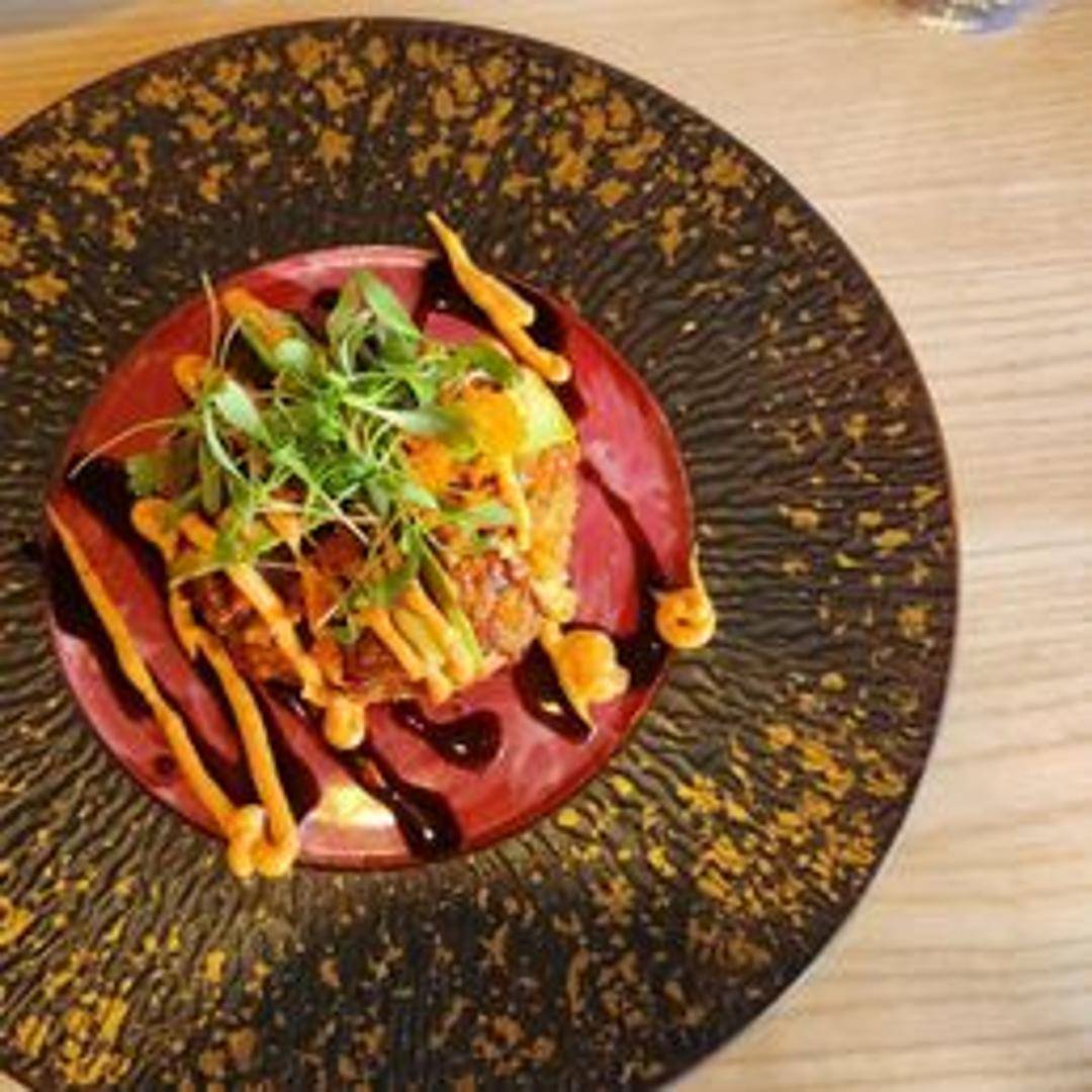 A sushi roll featuring spicy tuna and crispy tempura flakes or other crunchy elements for added texture. The roll provides a combination of heat, flavor, and satisfying crunch.