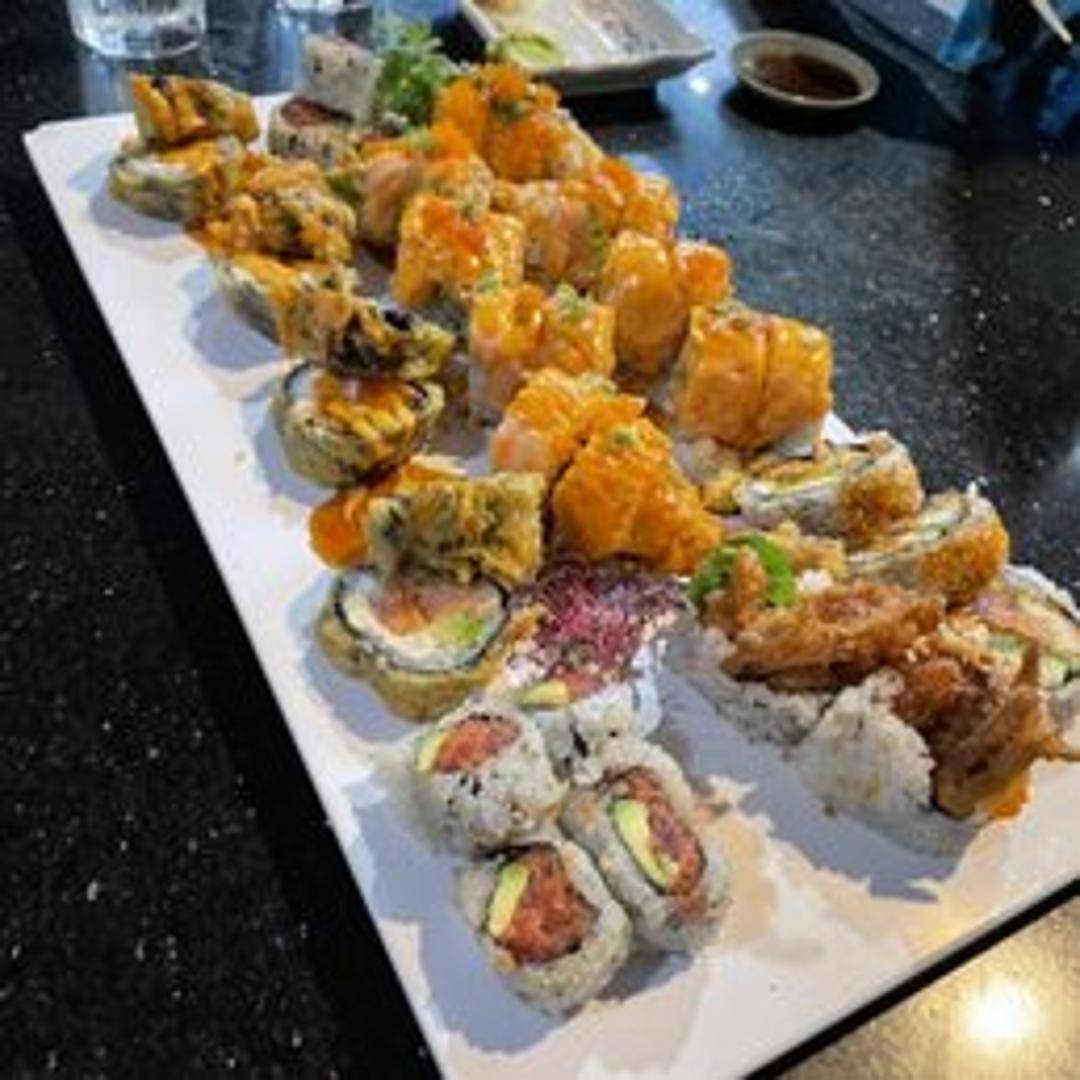 A large and substantial sushi roll. The specific contents differ, but typically incorporate a variety of fillings, such as tempura shrimp, crab, avocado, cream cheese, and a selection of sauces to create a filling and flavorful meal.